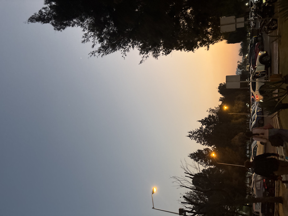 A twilight scene displays an ombre sky transitioning from blue to orange. Trees frame the top and bottom, silhouetted against the sky. A parking lot lines one side, filled with cars and illuminated by streetlights. People are walking.