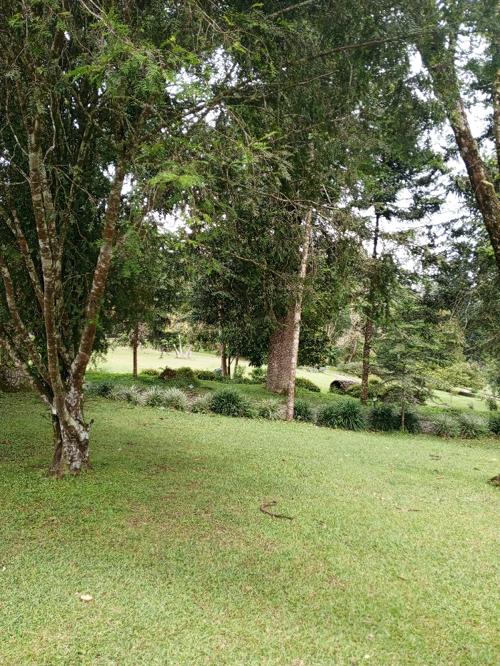 The image displays a lush, natural green space consistent with a park or garden environment within Đà Nẵng, Vietnam. The precise location within the city is not discernible from the visual evidence. The scene is dominated by dense foliage and manicured grass. In the foreground, a vibrant green lawn slopes gently downward from left to right. Scattered across the grass are small pieces of organic debris, including twigs and leaves. A single light-colored object, possibly a mushroom or a piece of fruit, rests on the grass in the lower-left quadrant. On the far left, a multi-trunked tree with light-colored, mottled bark stands prominently, its canopy extending out of view at the top. Several other trees with varying trunk textures and foliage densities populate the midground and background, creating a layered effect of green. A distinct band of lower-growing, dense green shrubs or ornamental grasses separates the foreground lawn from another grassy area beyond. The sky, appearing overcast and bright, is partially visible through gaps in the dense tree canopy at the top of the image. No people, animals, or artificial structures are visible within the frame. The overall environment suggests a well-maintained outdoor area with natural elements.