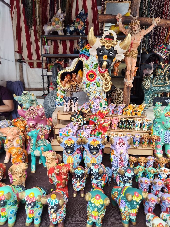 A vibrant display of handcrafted alebrijes, primarily in the form of intricately painted bulls. Colors abound, featuring floral patterns and geometric designs. Sizes vary, some are placed on tiered shelves. A larger bull with a hollowed-out interior reveals a Nativity scene. In the background, religious figures are displayed on a wooden cross, along with various other decorative items. The entire scene is filled with cultural and artistic elements.