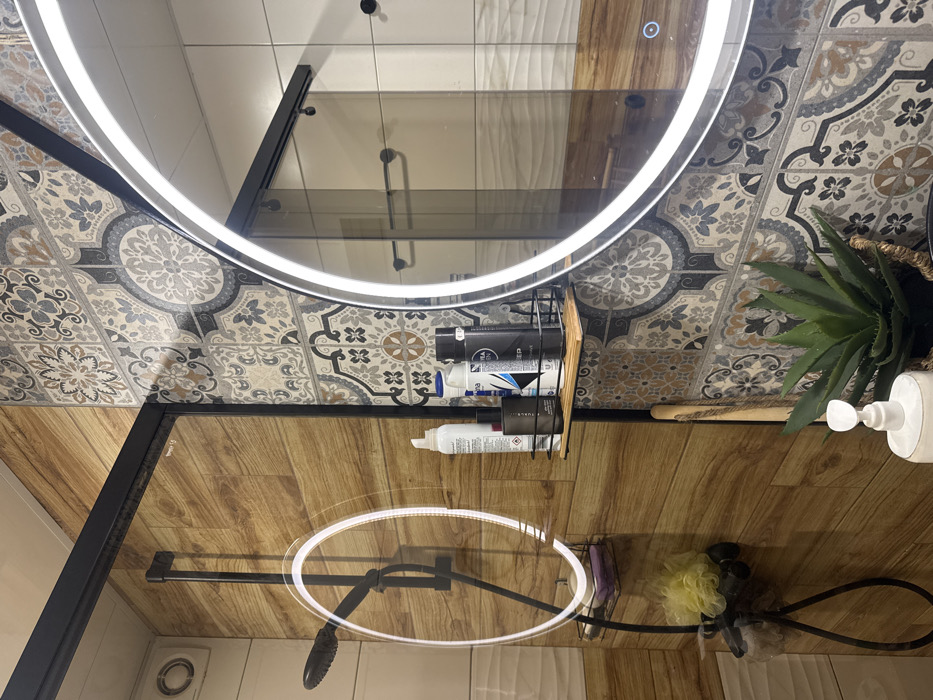The scene depicts a modern bathroom interior, located in Ruse, Bulgaria. The primary subject is a circular wall-mounted mirror featuring an illuminated LED light ring. To the left, a glass shower enclosure with black metal framing reveals an interior lined with horizontal wood-effect tiles on the lower section and white textured tiles above. A black shower head and hose are mounted within. A black wire shower caddy inside the enclosure contains a bar of soap and a yellow shower pouf. An exhaust vent is visible on the ceiling within the shower. The wall adjacent to the shower is clad with decorative patterned tiles in grey, beige, black, and blue motifs. A black metal and bamboo shelf unit is mounted on this wall, holding several bottles and spray cans, including products labeled "NIVEA MEN DEEP." Below the shelf, a wooden-handled brush rests against the wall. An artificial green succulent plant in a woven basket is placed on a surface below the mirror, alongside a white pump-dispenser bottle. Reflections in the mirror show a white tiled wall and a black towel rail. No individuals are present, and no activity is occurring in the static image.