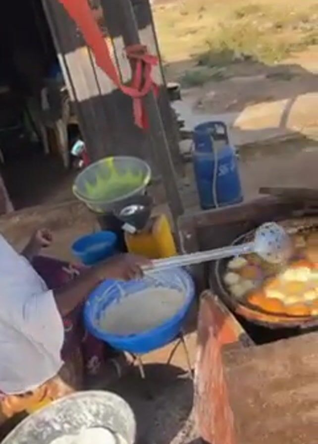 A woman wearing a white hijab is working at an outdoor food stall. She is using a slotted spoon to move round, golden-brown food items frying in a large, flat pan of oil. To her left are several containers of batter, including a large blue bucket and a grey container. Behind her is a small, dark building and a blue propane tank. In the background, across a street, a yellow auto rickshaw is visible.