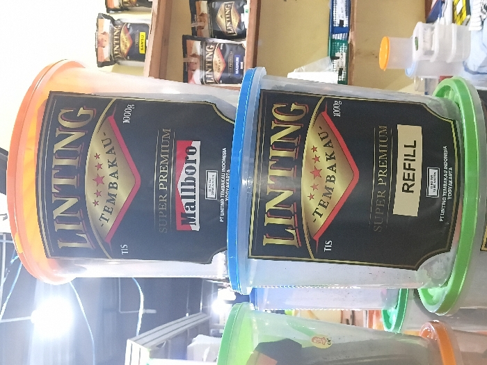 - "The image depicts two large, clear plastic containers of rolling tobacco ("LINTING TEMBAKAU") stacked vertically in an indoor retail setting in Mns Alue, Indonesia" by FM-f8CKP2, licensed under CC BY 4.0