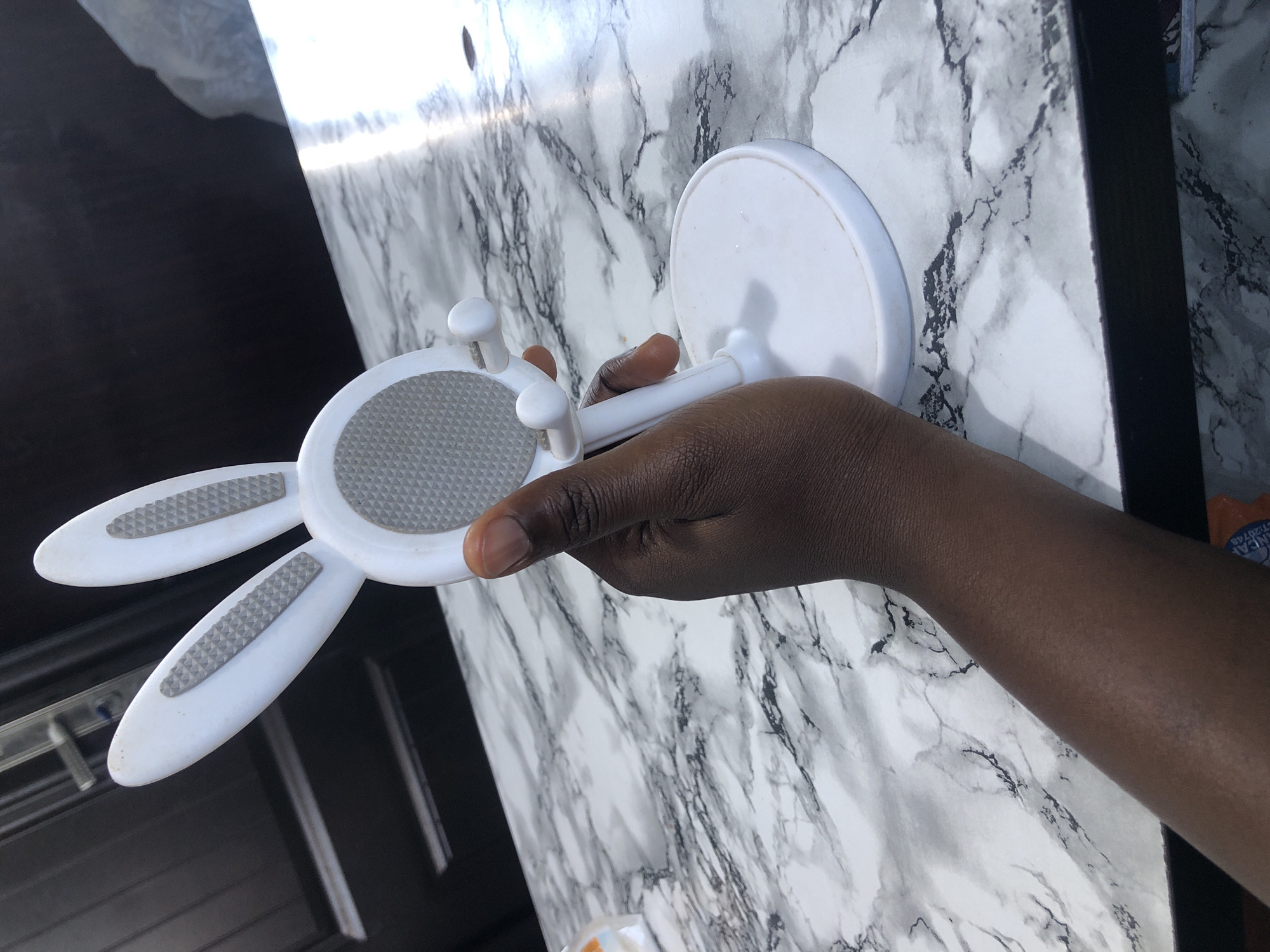 A person's dark-skinned hand holds a white plastic phone holder against a white and gray marble-patterned countertop