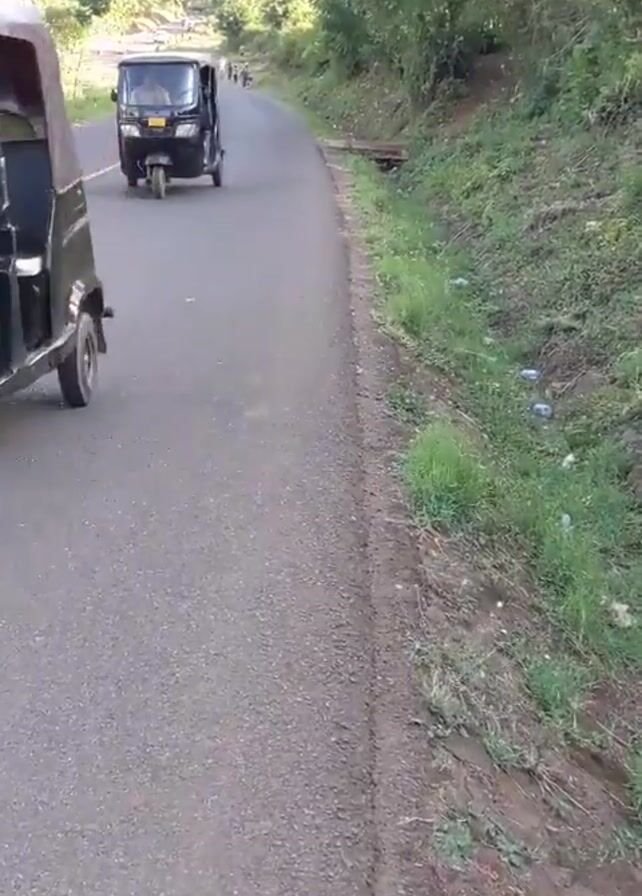 rural road with green vegetation to the side. Two black auto rickshaws are driving on the road. The first one drives past the camera, and the second follows behind. In the distance, people are seen walking along the road, headed in the same direction as the rickshaws. The video is recorded from a stationary position on the side of the road.