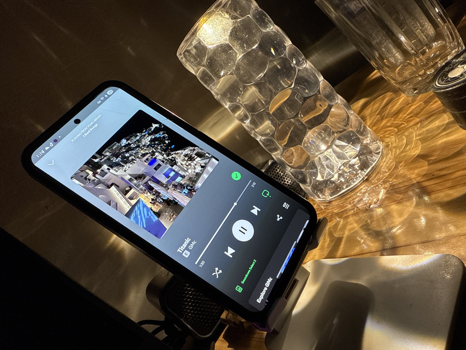 A smartphone displays the music app interface, playing "Titanic" by Gmc. The screen shows an image of white buildings against a dark background. The phone sits in a stand next to a glass lamp, casting light patterns on a wooden surface. The app indicates the song is from the user's Liked Songs and is playing on a Soundcore Select 2 speaker. The display also shows the song progress, with options to pause, skip, and repeat.
