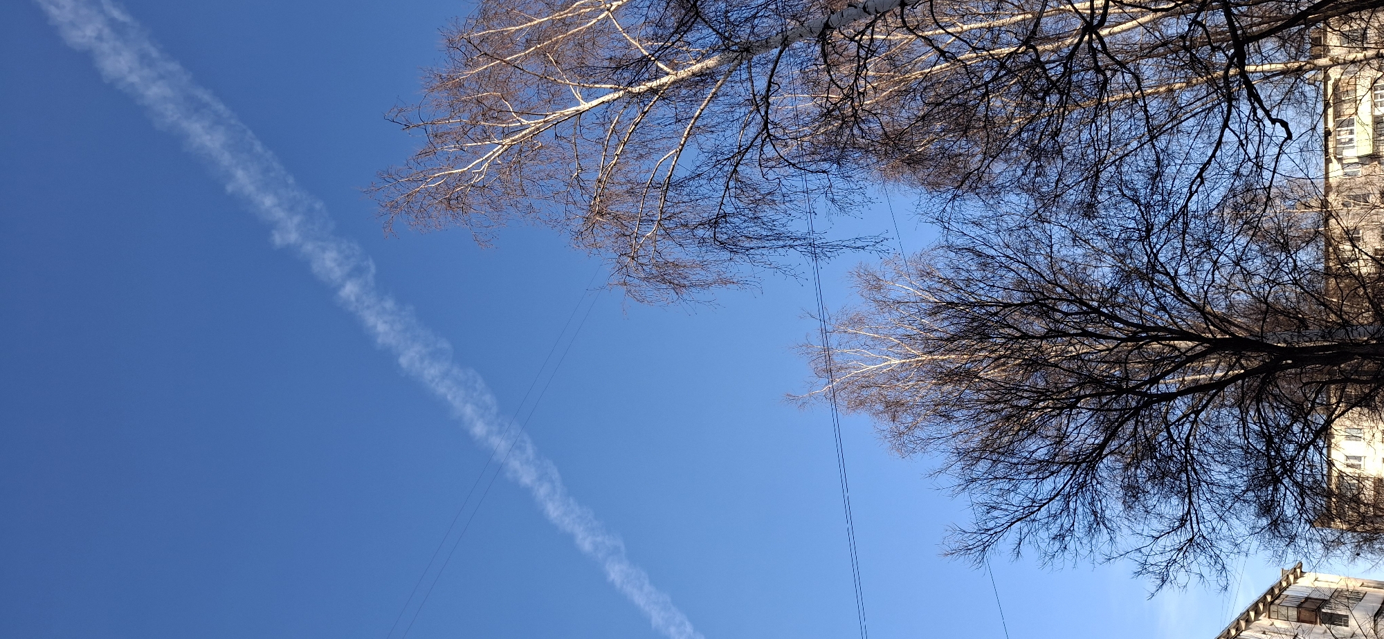 A low-angle photograph depicts a clear blue sky, intersected by a contrail extending from the lower left to the upper right of the frame. Bare tree branches are visible in the upper portion of the image, framing the sky. Thin electrical wires span the space between the branches. A building is visible in the lower right corner. The photo was taken in Chaikovsky, Russia.