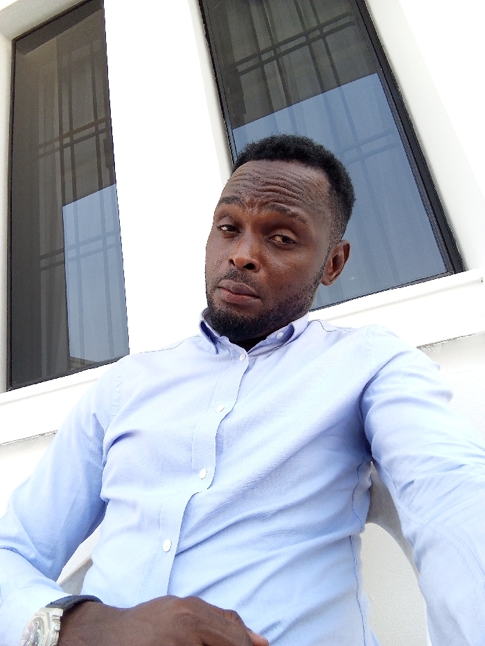 An adult male with dark complexion, short dark hair, a full beard, and a mustache is seated in front of a white building wall in Guzape, Nigeria