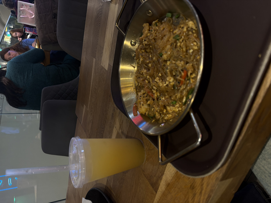 The image depicts an indoor dining scene, likely within a modern restaurant or cafe. In the foreground, a light-brown wooden table features a clear plastic cup with a lid and straw, containing an opaque yellow beverage, positioned on the left. To its right, centered on a dark brown rectangular serving tray, is a round, shallow metal pan with two handles, containing a dish of translucent noodles, scrambled egg, shrimp, chopped green onions, and red chili slices, garnished with black sesame seeds. In the mid-ground, at an adjacent table, two individuals are seated. The closest person, seen from behind, wears a dark green garment. To her right, a second individual with brown hair and a blue top is visible, facing left. A third person is partially visible behind the second individual. The chairs are dark gray and upholstered with a quilted pattern. The background reveals a large glass partition or window reflecting ambient light, beyond which indistinct blue neon lighting elements are visible. The specific location within Saint Petersburg, Russia, cannot be determined from the visual information provided in this image.