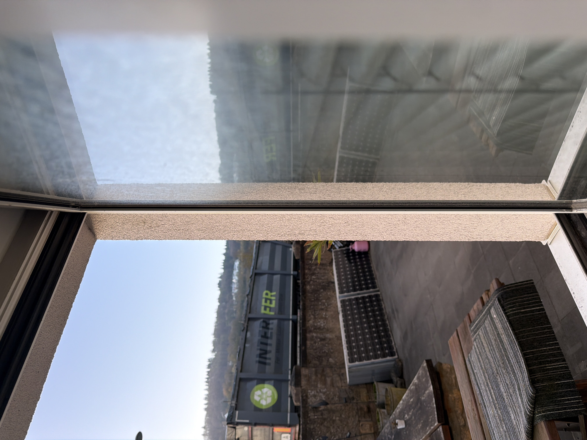 The image depicts an outdoor scene viewed from an interior space in Grevenmacher, Luxembourg, through an open aperture on the left and a reflective glass pane on the right. On the left, a direct view shows an outdoor patio paved with dark tiles. In the immediate foreground, a rustic wooden table and matching bench are positioned, with a dark grey and white striped mat draped over the bench. A small white pot sits on the table. To the left of the table, several terracotta pots are visible. In the midground, two large, dark, rectangular panels, consistent with solar panels, are stacked horizontally on the ground. A pink container stands upright near these panels. Beyond the patio, a stone retaining wall supports an elevated area. On this elevated area, a dark grey industrial container or truck trailer with "INTER FER" in green lettering and a green recycling symbol is prominent. In the background, a dense forested hillside rises under a clear, light blue sky, with indistinct structures visible along the ridge. The right side of the image features a reflective glass pane, mirroring the outdoor scene with visible reflections of the sky, forested hillside, the "INTER FER" container, and the patio furniture, all appearing somewhat blurred and distorted due to the reflective surface. The entire view is framed by light-colored, textured building walls and dark window/door frames.