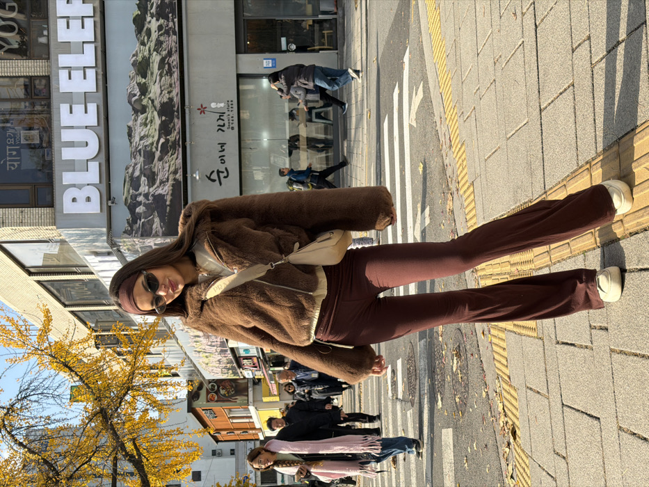 A young woman stands on a sidewalk near a crosswalk. She wears a brown fleece jacket, brown pants, and white sneakers. A light-colored purse hangs across her body. She has dark hair and sunglasses. In the background, a Blue Elephant sign is visible, along with other buildings and people walking. A yellow-leaved tree adds a touch of autumn color to the scene. The image has been rotated.