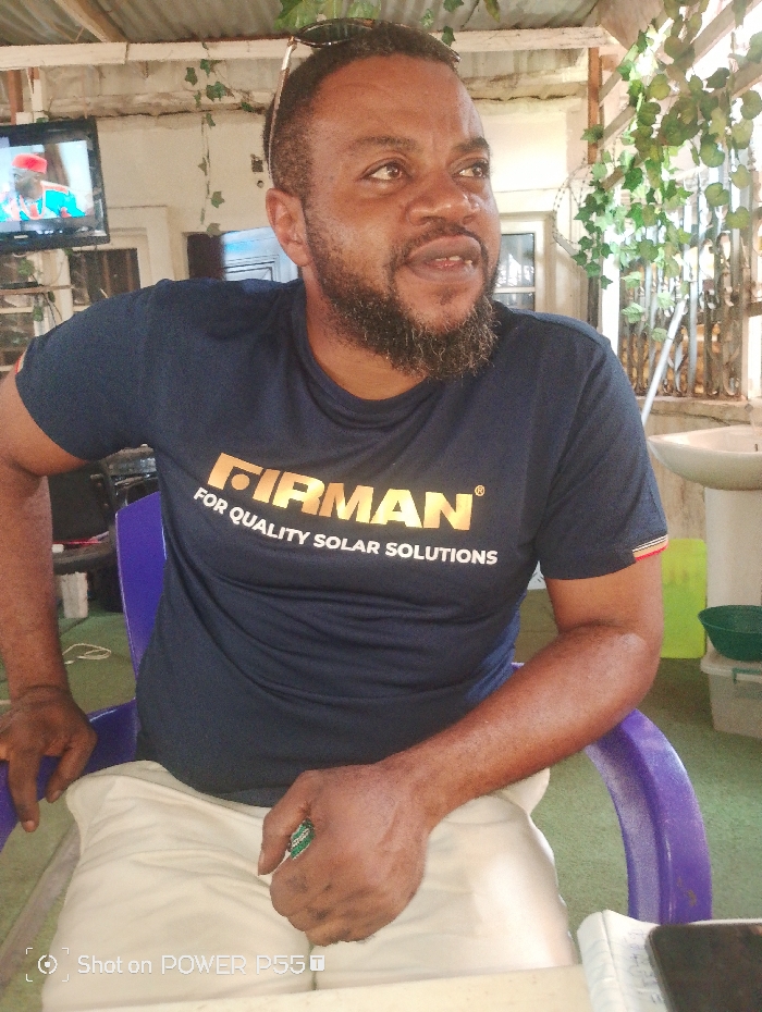 A mid-adult male, dark-skinned with a full beard and short dark hair, is seated in a purple plastic chair. Sunglasses are perched on his head. He wears a dark blue t-shirt with "FIRMAN" in orange text and "FOR QUALITY SOLAR SOLUTIONS" in white text. He wears light-colored trousers. His gaze is directed to his right (viewer's left), with his mouth slightly ajar. His left hand rests on his left thigh, holding a small green object. The setting is a semi-open, covered area, likely a casual establishment. The ceiling features corrugated metal sheets and exposed wooden beams, from which artificial green foliage hangs. To the left, a wall-mounted flat-screen television displays content. To the right, a white ceramic sink is visible. The floor is covered in green material, possibly artificial turf. A table in the foreground partially displays a smartphone and a notebook. The exact location within Abuja, Nigeria, is not identifiable from the visual information.
