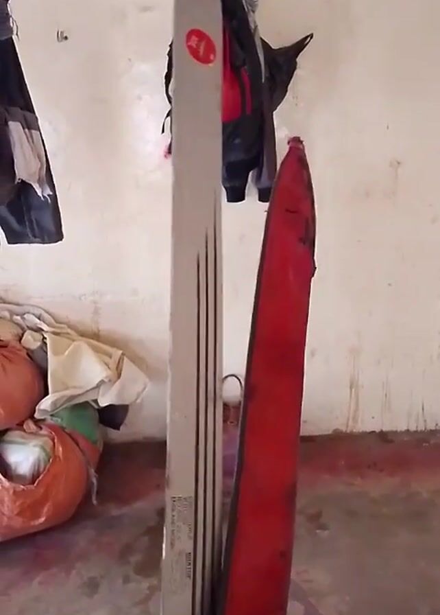 A person is holding two long blades in a room. One blade is silver with three black stripes and the words "Crocodile Machete England and Made" written on it. The other blade is red. Several bags of orange and white materials are on the floor. A black jacket and a backpack hang on the wall. There is a brown bag on the floor near the wall. The floor is a red color in some areas.