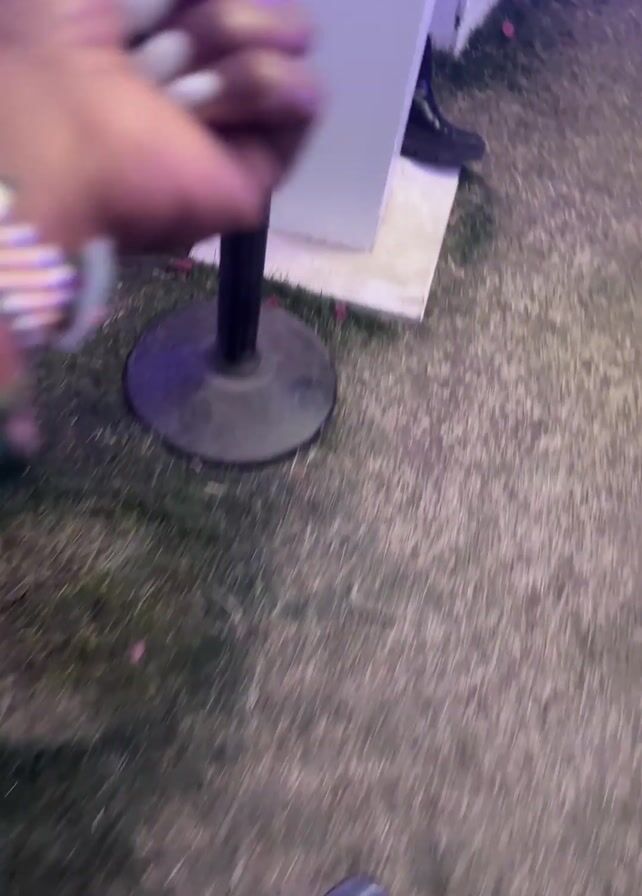 A hand with short white nails touches a white outdoor table that is lit up with blue and purple lights, then walks away. The table has a metal stand with a circular base. The ground is grass and dead leaves. A white building is visible in the background, lit up with blue light. The video is shaky.