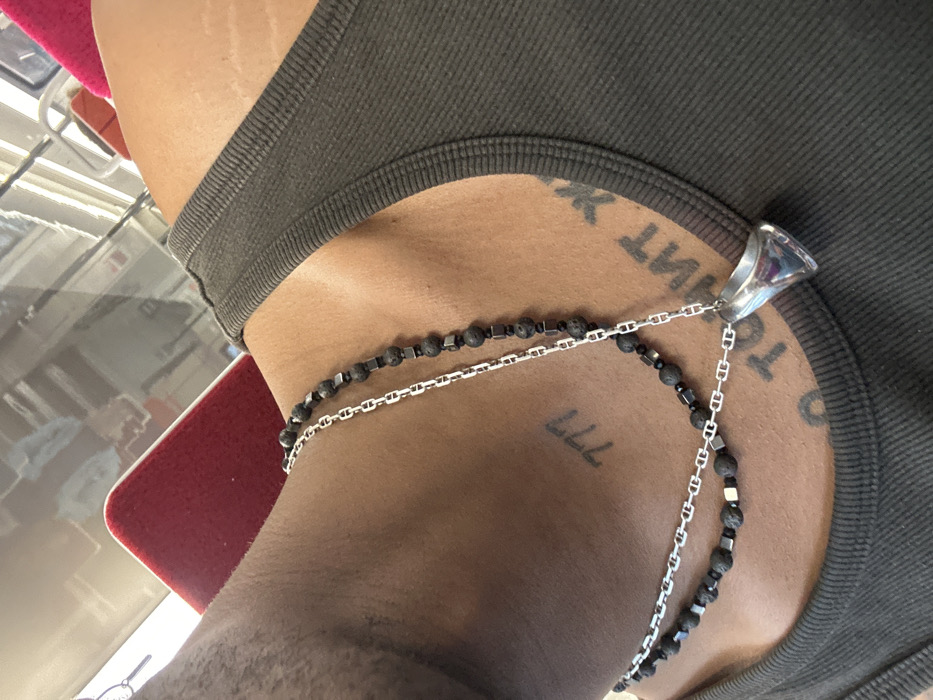 The image displays a close-up, angled view of an individual's upper torso, specifically the neck and upper chest, in Coye-la-Forêt, France. The subject has brown skin and is wearing a dark olive green ribbed tank top. Two layered necklaces are visible around the neck. The longer necklace consists of a silver-colored anchor-link chain strung with black porous beads and small square metallic beads. The shorter necklace, also a silver-colored anchor-link chain, features similar black porous beads and metallic beads, and suspends a polished, reflective, bell-shaped silver-colored pendant. A tattoo depicting the numbers "777" is visible on the left side of the neck/collarbone area. On the right side of the chest, beneath the clavicle, a partial black textual tattoo is present, appearing inverted or mirrored. The background is out of focus, revealing a bright red upholstered surface and reflections of an outdoor environment and interior structures (consistent with a window) in a glossy surface, indicating an interior vehicle setting.