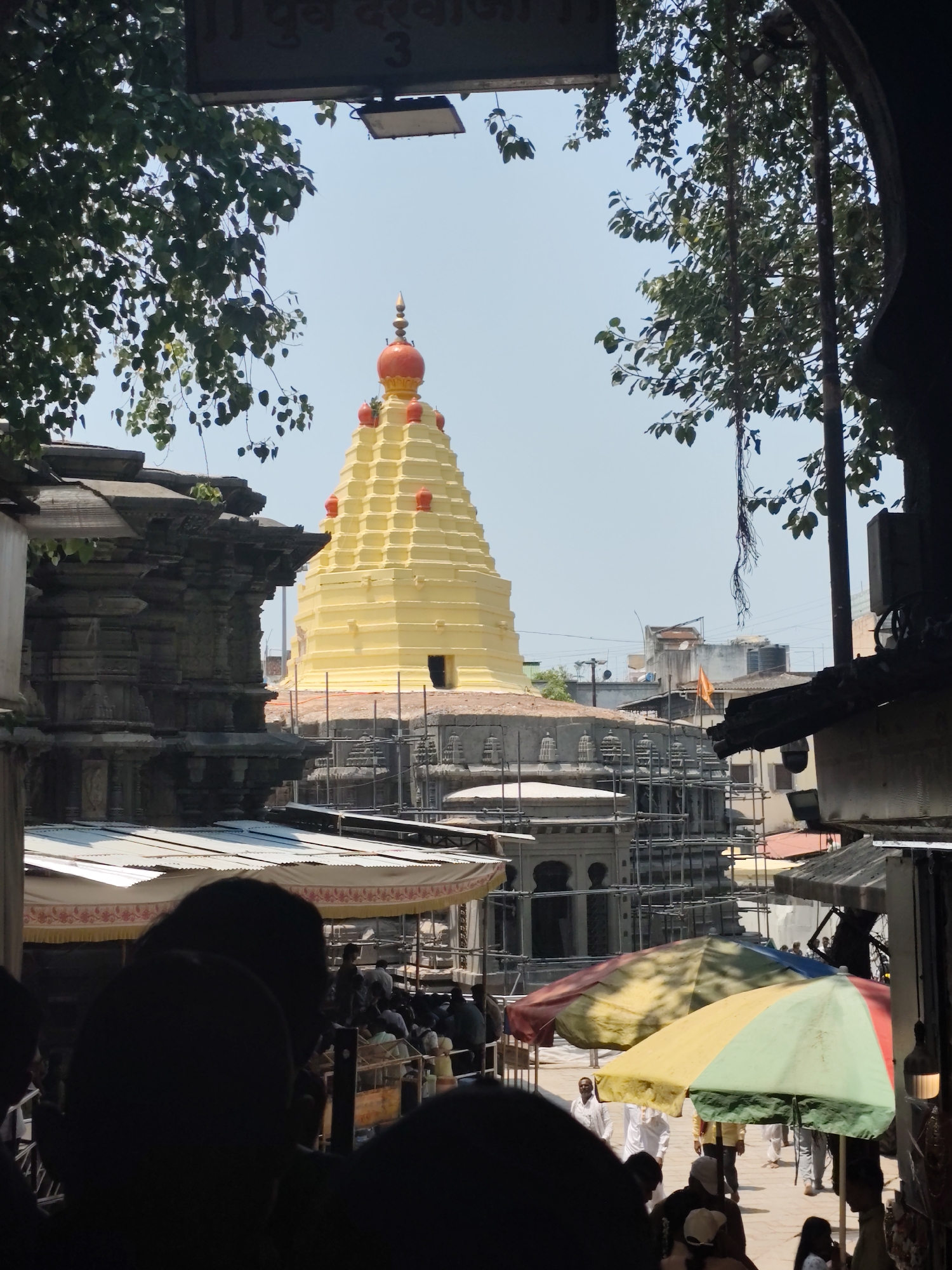 The image displays an outdoor scene within the Mahalaxmi Temple complex in Kolhapur, India, viewed from a slightly elevated position, possibly through a gateway. The central subject is a prominent, light yellow, stepped pyramid-shaped temple spire (shikhara), featuring a large red, bulbous finial at its apex and smaller red elements on its tiers. This structure is characteristic of the Mahalaxmi Temple. The foreground is framed by dark silhouettes of dense green foliage, consistent with large trees, notably on the left and right sides of the frame. A dark horizontal sign with white Marathi script and a rectangular light fixture are visible at the top. The lower foreground is obscured by dark silhouettes of numerous people's heads and shoulders, indicating a crowded area. To the left of the yellow spire, a dark, intricately carved stone structure, likely part of an older temple building, is partially visible. Below the main spire, scaffolding surrounds a lower section of the temple complex, suggesting ongoing construction or renovation. Areas beneath these structures are covered by white corrugated sheet roofs and temporary awnings with decorative borders. The mid-ground shows an open courtyard or market space populated by numerous individuals. Two large, multi-colored market umbrellas (red, yellow, and green segments) are prominently positioned in the lower mid-ground, providing shade. People are depicted walking and congregating; some individuals are wearing white garments. In the background, under a clear, light blue sky, various multi-story urban buildings with flat roofs, water tanks, and satellite dishes are visible. A small orange flag is discernible on one of the distant rooftops. The scene depicts a sunny, active temple precinct combining historical architecture with elements of a bustling urban environment.