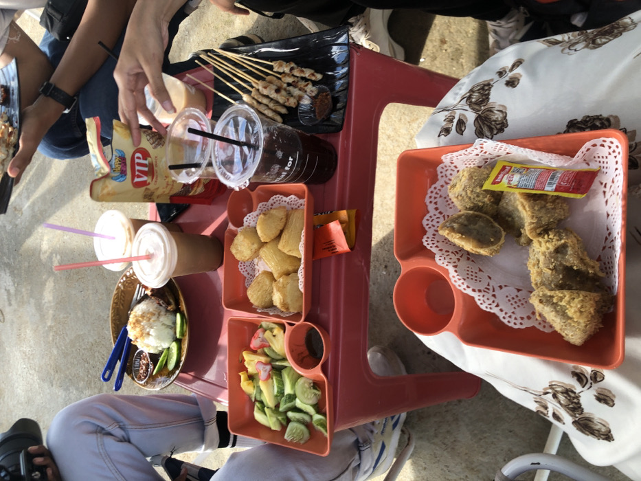 An outdoor eating scene in Demaan, Indonesia, captures a gathering around a small, rectangular red plastic table set on a light-colored paved surface