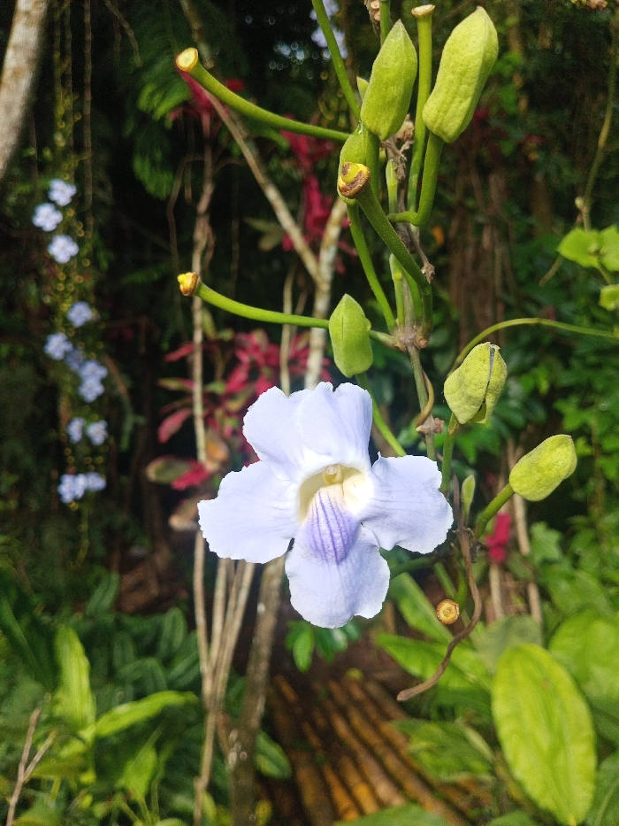 A close-up reveals a delicate, light purple flower with darker purple stripes leading into its center, positioned among lush greenery. Several green, bulbous flower buds are visible on slender stems around the flower. A cascade of small, light blue flowers hangs faintly in the background, adding depth to the scene. Other colorful foliage, including red plants, is scattered, contributing to the vibrant, natural setting.