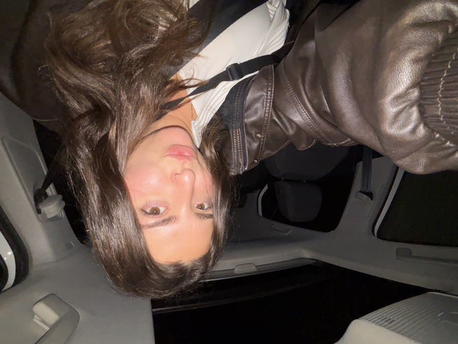 An upside-down, close-up shot features a woman with long, brown, wavy hair, light skin, and brown eyes. She has a full lower lip and is wearing a light-colored striped top underneath a brown leather jacket. A black strap runs across her body. The setting appears to be inside a car at night, with a sunroof visible above. The car's interior is light-colored, contrasting with the darkness outside.
