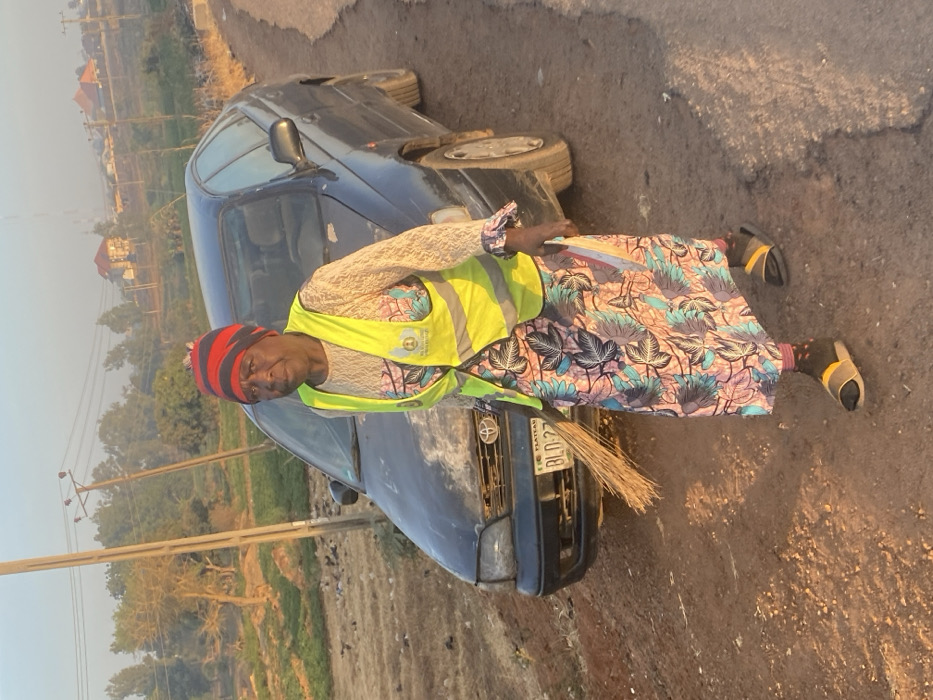 An elderly woman wearing a striped hat, floral dress, and a bright yellow safety vest stands beside a dark-colored car. She holds a broom in her right hand. The car's license plate is visible. The scene appears to be a roadside with foliage in the background. The photograph's orientation is rotated.