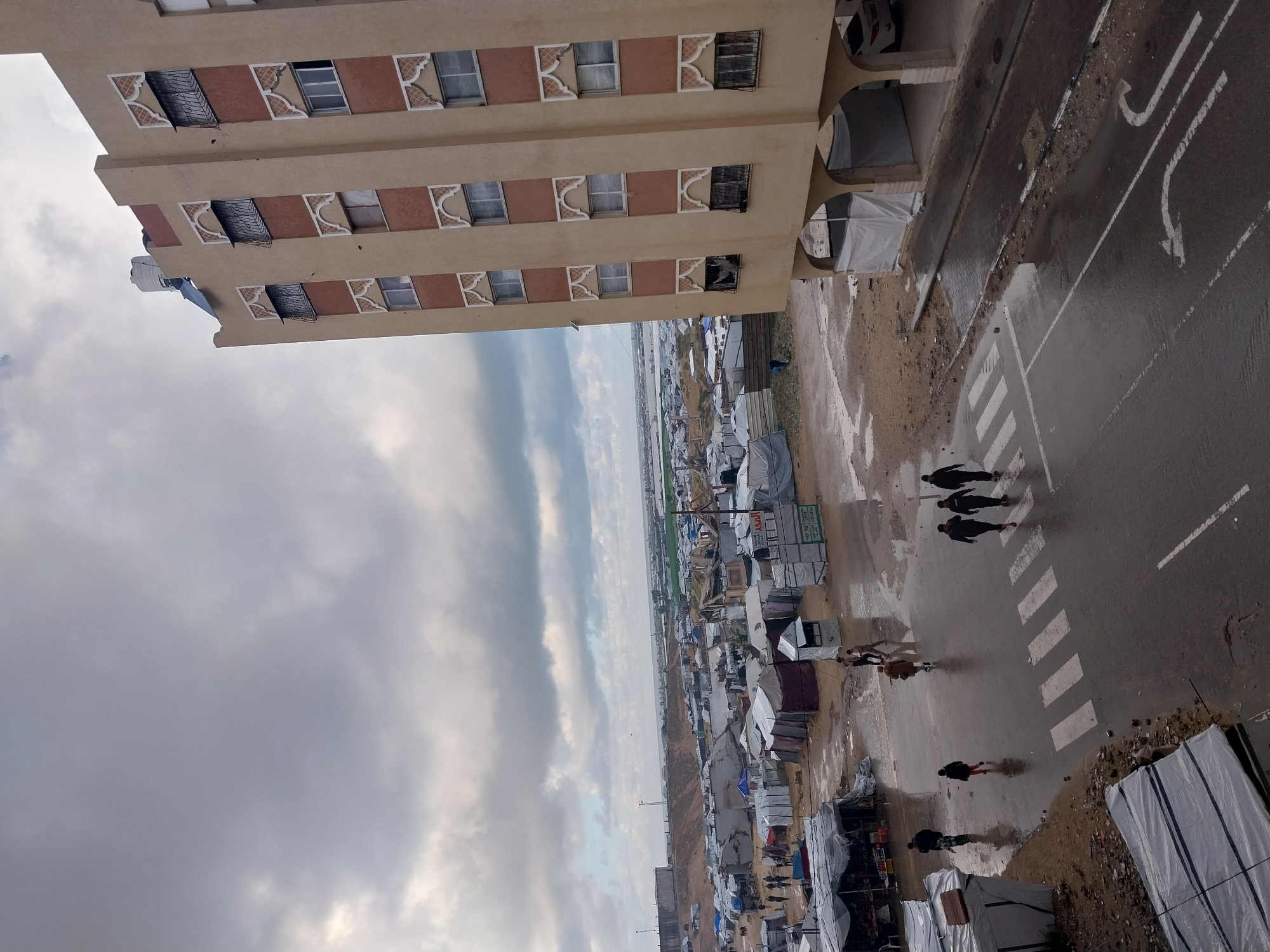 A high-angle photograph captures a crowded urban and camp landscape in Khan Yunis, Palestinian Territory, under an overcast sky. In the foreground and mid-ground, a wet asphalt road, indicative of recent rainfall, traverses the scene. It features a white pedestrian crossing with zebra stripes and white lane markings, including a right-turn arrow. Several individuals are present on the road: three figures (two men, one woman) walk from left to right across the crosswalk, while others walk in various directions further along the road and near the shoulders, which are muddy and littered with debris. To the right, a multi-story, light brown building with reddish-brown panels and decorative white arched patterns around its numerous rectangular windows dominates the vertical space. Many windows are fitted with dark metal security grates; some windows appear to be open or broken. A white water tank and partial roofing are visible on the building's top. The ground floor of this building features arches, creating an open or sheltered area beneath. Extending from the left mid-ground towards the distant horizon is a vast, densely packed encampment composed of numerous makeshift shelters and tents. These structures are constructed from various materials, including tarpaulins, corrugated metal sheets, and fabrics, often appearing in disrepair. People are discernible moving between these shelters. Some structures appear to be small market stalls, with goods visible in the lower-left corner and Arabic script on signs. The ground within the camp is muddy and uneven. In the far background, beyond the camp, a sandy berm or elevated land gives way to what appears to be a large body of water, possibly the Mediterranean Sea or a lagoon, under the same heavy, gray clouds. Distant land or structures are faintly visible on the horizon. The overall scene suggests a densely populated area with temporary housing infrastructure and a visible transition between urban structures and a large displacement camp.