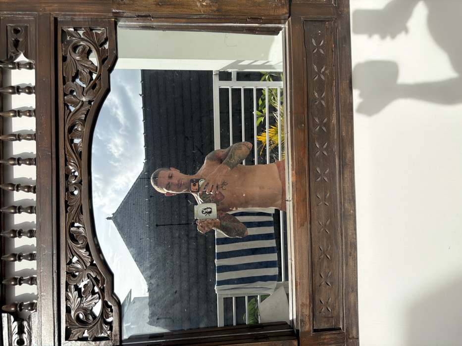 A shirtless, tattooed man is reflected in an ornate, dark wood-framed mirror. He holds a phone in one hand and a white object with a black image in the other. Outside the reflection, a house with a gray roof and a blue and white striped towel on a balcony can be seen. The background includes a white wall with a shadow. The mirror frame features intricate carvings.