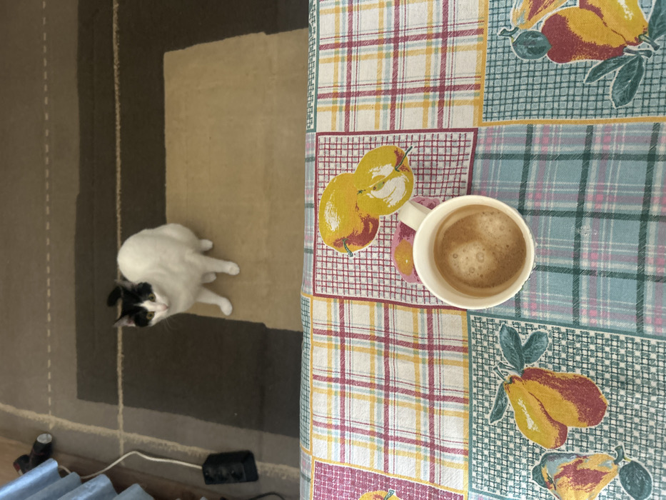 An indoor scene in Kresna, Bulgaria, features a bicolored cat and a beverage. In the foreground, a table is covered with a multi-patterned tablecloth, exhibiting plaid sections in red, yellow, green, and blue, alternating with squares depicting fruit designs. A white ceramic mug containing a light brown liquid with a foamy top, consistent with coffee, rests on the tablecloth. On the floor, a carpet with alternating dark brown and tan rectangular sections is visible. A white cat with black markings on its head and tail is positioned on the tan section of the carpet, looking towards the viewer with light-colored eyes. In the background on the left, a blue fabric (possibly a curtain or drape) and a black power strip with an attached cable are present on the carpet.