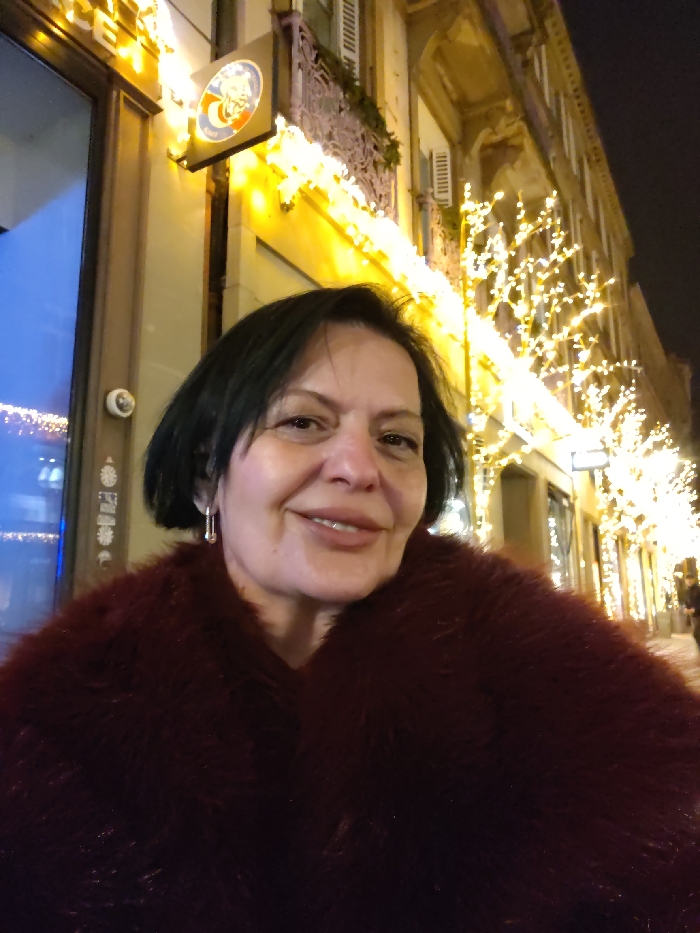 A woman stands outdoors at night, smiling slightly. Buildings adorned with strings of lights form the backdrop. She wears a dark, furry garment. A lit sign hangs above a door to her left. Additional lights are visible within the building. The lighting casts a warm glow over the scene, highlighting her features and the festive decorations.