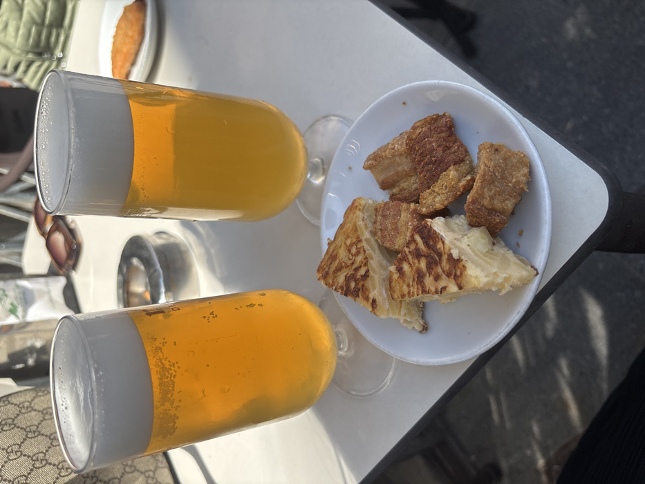 This image captures a close-up view of a white outdoor table in El Espinar, Spain, bathed in direct sunlight. Two tall, stemmed glasses filled with golden-yellow beer topped with white foam are central subjects. The left glass displays faint numerical and textual markings ("1ª DE"). A small white ceramic plate in the foreground holds three triangular slices of potato omelette (tortilla española) and five irregular pieces of fried pork belly (torreznos). Behind the glasses, a metallic ashtray and a pair of brown sunglasses with dark lenses are visible on the table. A portion of a patterned beige handbag is partially seen on the left side of the table, and another small white plate with a single, elongated fried item is present further back on the right. The blurred background indicates the presence of at least two individuals, one wearing a green garment. Shadows from the table and objects are cast onto the surface and the dark ground below, consistent with an outdoor terrace setting.