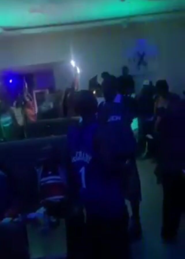 dimly lit room with numerous people gathered. The room is illuminated by green, blue, and red lights, potentially from lighting fixtures. In the center of the room, an individual holds up two glowing, cross-shaped light objects. Several other people are visible in the background, and the room seems to be in a club or lounge setting.