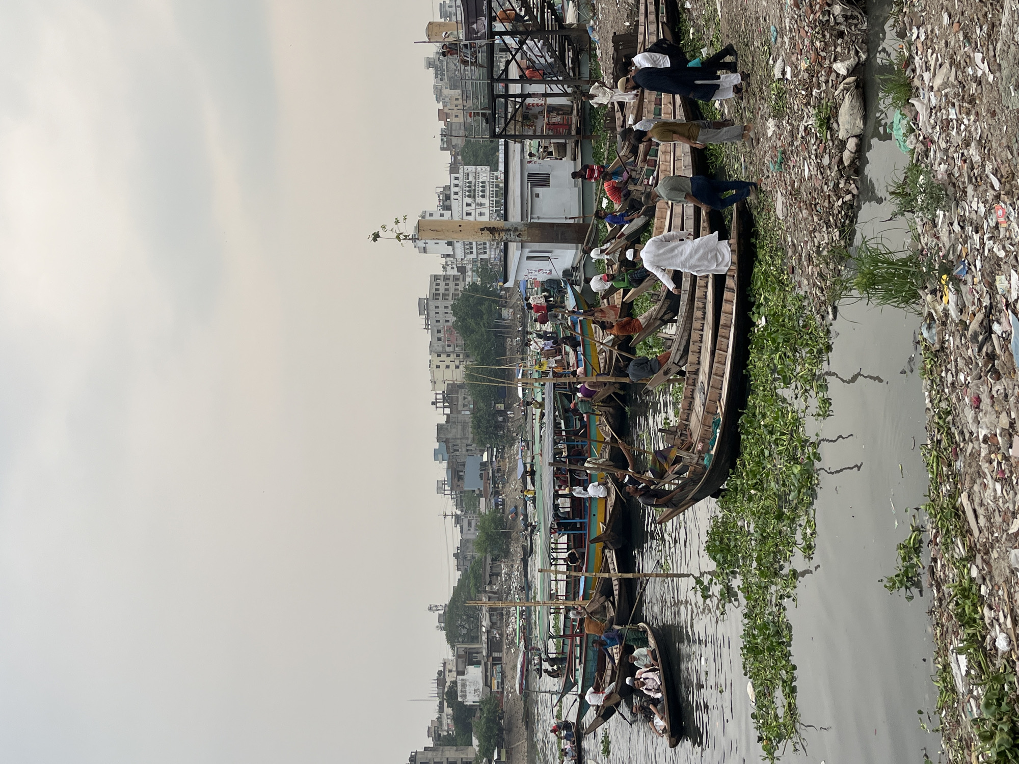 The image depicts a scene along a polluted waterway in Dhaka, Bangladesh. Several narrow boats are docked or moving along the water, filled with people, some wearing white. People on the boats seem to be engaging in activities such as fishing or transportation. The water is choked with water hyacinth and littered with debris. The bank of the waterway is also covered in garbage. In the background, buildings of varying heights are visible, suggesting an urban environment. The sky is overcast, contributing to a hazy, grim atmosphere.