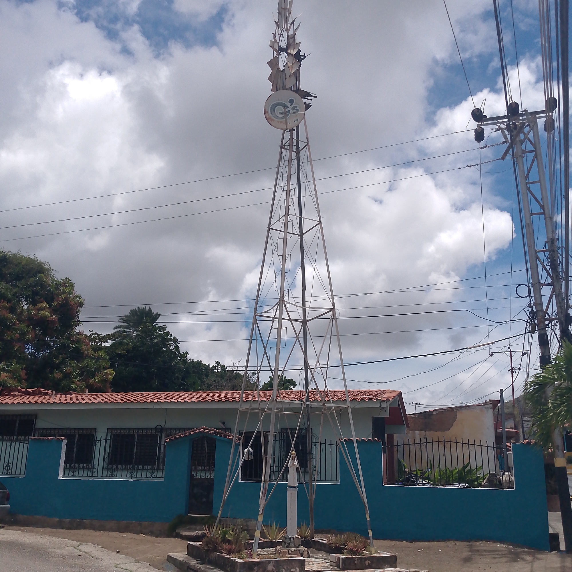 metal windmill structure with a damaged "G&S" logo at the top. The structure is located in front of a low-lying building with a red tile roof and blue trim. A statue is placed in a small garden at the base of the windmill. Power lines are visible in the sky. The location is in Tacarigua, Venezuela.
