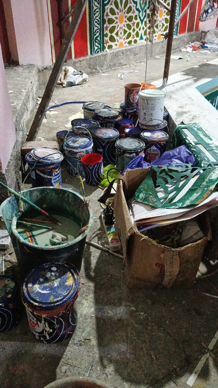 A cluttered scene depicts numerous paint cans, buckets, and painting supplies scattered on a concrete surface. Some containers are stacked, others are open, and some hold brushes submerged in liquid. A cardboard box filled with paper and stencils sits nearby. In the background, a wall showcases intricate geometric patterns in green, red, and beige, with parts of a ladder visible against it. The overall setting suggests an ongoing or recently completed painting project.