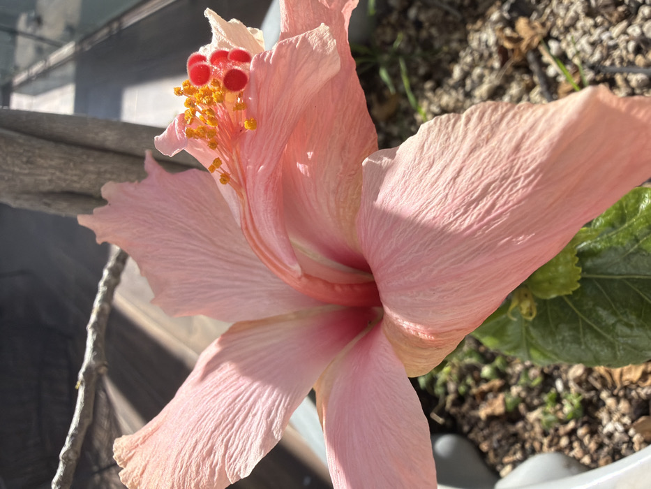 A close-up captures a delicate pink hibiscus flower. The flower's petals, slightly ruffled, exhibit a soft, textured surface. The stigma is adorned with several round, vibrant red structures, from which numerous yellow stamens protrude. A single green leaf peeks out from behind the flower, juxtaposed against a background of gravel. The flower appears to be positioned in a pot or container, indicated by the glimpse of a gray material to its left.