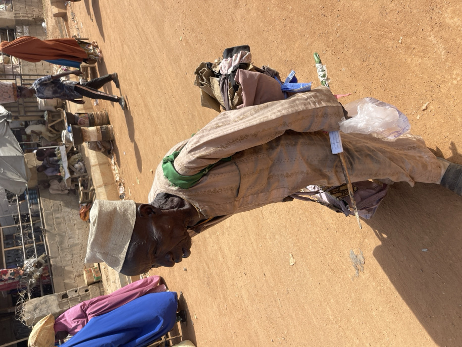 An elderly individual with dark skin and prominent facial wrinkles walks on an unpaved reddish-brown dirt road under bright sunlight. The person, positioned in the foreground and facing left, wears a light-colored, patterned long tunic (boubou) with a green strap visible on the left shoulder and a light beige cap. A large bundle of various materials, including fabric scraps and cardboard, is secured to their back. In their right hand, they hold a wooden stick horizontally, from which a small white piece of paper is attached and a clear plastic bag hangs. In the mid-ground and background, other individuals are visible. To the far left, a person in a blue garment stands near another in a pink garment with a light item on their head. Further back, a young person wearing a dark tie-dye shirt and dark pants walks right, carrying a large basket on their head. Another person in a reddish-brown full-body covering walks behind them. Along a low concrete wall in the background, several people are seated at market stalls with various goods displayed. The setting appears to be a busy market street or commercial thoroughfare in the city of Unknown, Unknown.