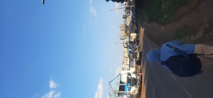 An individual with a backpack and a blue jacket walks on a road. The scene captures a cityscape with buildings lining the street and various vehicles. The sky above is bright blue with scattered clouds. Overhead wires stretch across the urban landscape. The person is walking along a roadside, adjacent to the bustling city environment.