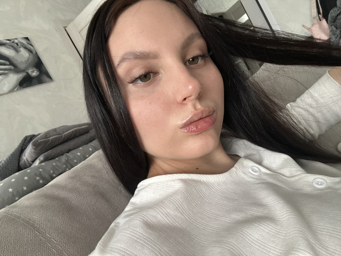 The scene is an indoor domestic setting located in the city of Noviy, Russia. A female individual is prominently featured in a selfie-style photograph, occupying the foreground and midground. She has long, dark hair, brown eyes, and fair skin, with her lips forming a glossy pout. She wears a white, ribbed long-sleeved top with visible white buttons down the front. Her dark hair partially obscures her left eye. The individual is positioned against a light grey upholstered surface, likely a sofa or bed. In the background, a light-colored wall displays a framed black and white artwork, depicting a close-up of two faces in an intimate embrace, with one person's lips near another's ear/neck. A white door frame is visible to the right of the artwork. Below the artwork, a bed or sofa is present, covered with a grey blanket patterned with white stars, and additional folded grey textiles. A light pink bag hangs in the upper right background. The environment is illuminated by ambient light, consistent with daytime.