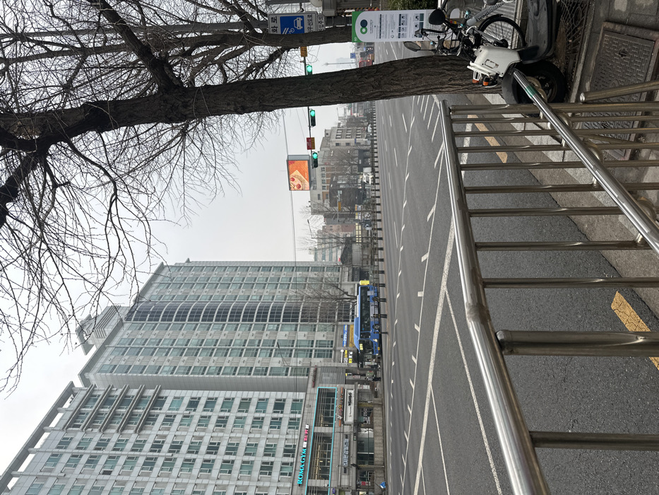 An urban scene shows a high-rise building with many windows under a gray sky. A tree with bare branches overhangs the scene, casting shadows. A road with white parking lines is visible, with a bus driving along it. A silver metal railing runs along the edge of the frame. A scooter is parked near the tree. A sign with a pizza image is positioned between the tree and the building.