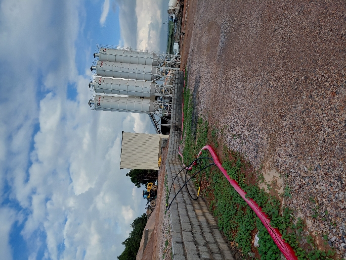 The image depicts an industrial outdoor scene in Bni Yakhlef, Morocco, under a partly cloudy sky. In the foreground, a low wall constructed from gray cinder blocks runs horizontally on the left. Adjacent to the wall, a strip of green ground cover grows, traversed by a thick, corrugated, bright pink hose or cable and several black cables. The rest of the foreground consists of a gravel surface. In the midground on the left, an earth mound supports green foliage and a yellow construction vehicle, possibly a bulldozer or grader, partially visible. To the right of the mound, a tall, rectangular structure with a textured facade stands. To its right, a cluster of five tall, cylindrical, white silos with red branding is prominently featured, supported by a metal framework, with a conveyor system leading to them. The background shows a continuation of the gravel area, with distant white vehicles, including what appears to be a cement mixer truck, visible on the far right under the cloudy sky. No individuals are visible.