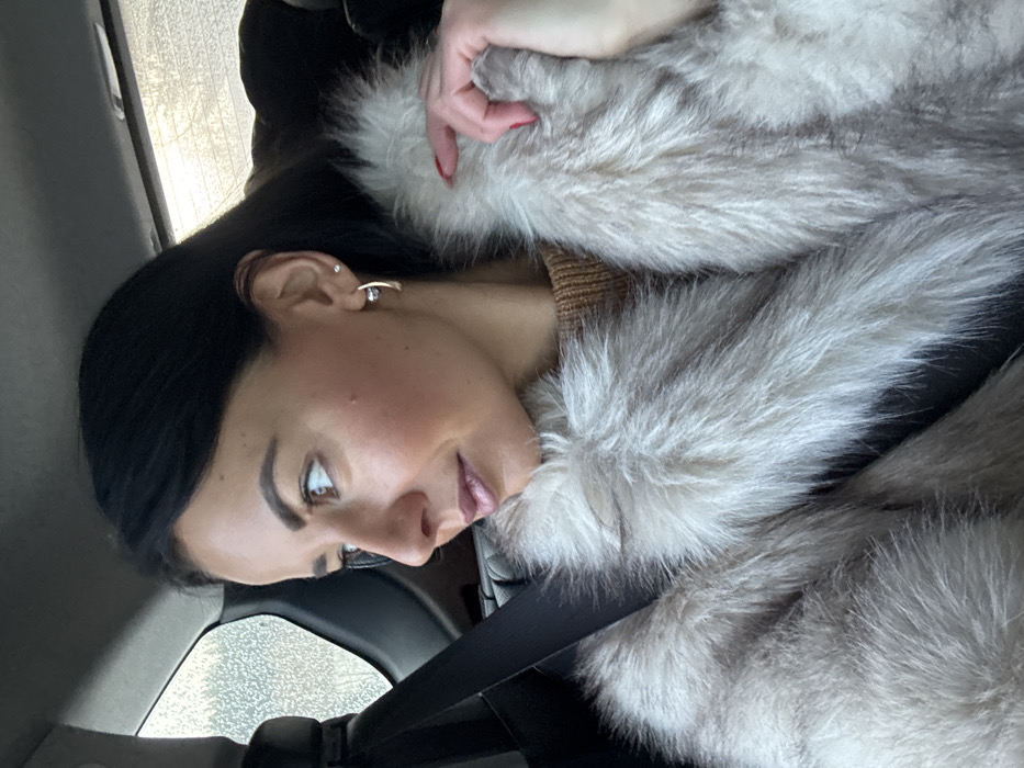 The scene is set inside a vehicle located within the city of Lohberg, Germany. A female subject is depicted seated in a passenger position, secured by a dark-colored shoulder seatbelt diagonally across her torso. She possesses dark hair and a light complexion, with applied facial cosmetics including blush and lip color. Her left ear is adorned with two earrings: a small stud and a larger, gold-toned U-shaped earring featuring a clear stone. She wears a voluminous, light beige or off-white fur-textured coat over a visible brown ribbed sweater. Her right hand, featuring red nail polish, is positioned near her upper chest, grasping the fur material. The subject's gaze is directed towards the left, outside the vehicle's side window. Both the side window and a portion of the rear window exhibit a frosted or moisture-laden appearance, suggesting cold or wet external environmental conditions. The visible interior elements of the vehicle are primarily dark in tone.
