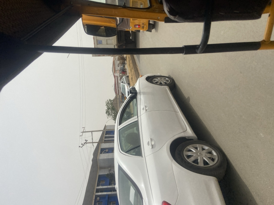The image captures a daytime street scene from the perspective of a passenger within a yellow motorized tricycle, likely in a city in Nigeria. A white Toyota Corolla sedan occupies the left foreground, positioned parallel to the viewer's vehicle on an asphalt road. To the right, partially obscured by the tricycle's frame, the rear of a light-colored dump truck is visible, displaying a Nigerian license plate "ABC-7A". Further down the road, a silver sedan is parked or stationary on the right shoulder, beyond which a small group of individuals is gathered. In the left background, a multi-story building with blue and light-colored panels stands, fronted by utility poles and power lines. The distant background features additional smaller structures with reddish roofs. The sky is hazy, indicative of atmospheric dust or diffused sunlight.