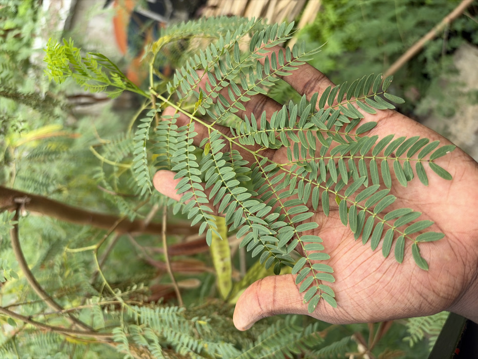 A dark-skinned hand holds a vibrant green branch of a mimosa tree