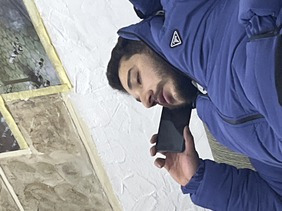 A man is holding a dark cell phone to his ear, seemingly in conversation. He has dark hair and a beard, and wears a blue padded jacket with a triangular logo. The background is predominantly white with a textured surface. Adjacent to the white background are framed artworks or images, one depicting a landscape with figures, attached with yellow tape.