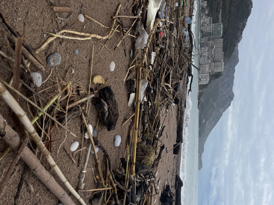The image depicts a debris-strewn sandy beach in Rafailovići, Montenegro, under an overcast sky