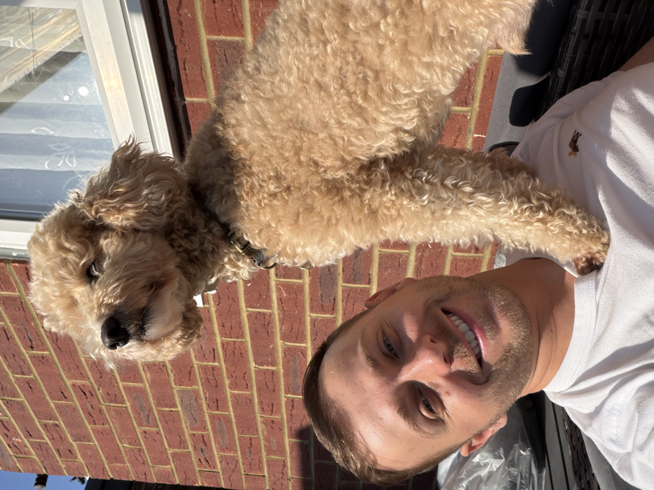The image displays a male individual and a dog outdoors, set against a red brick building within the city of London, United Kingdom. The male, positioned in the lower left, is Caucasian with short brown hair, blue eyes, and light facial stubble. He is smiling directly at the camera, revealing teeth. He wears a white t-shirt featuring a small, dark brown embroidered animal emblem on the right chest. A light brown, curly-haired dog, consistent with a Poodle or similar breed, occupies the center and right portions of the frame. The dog wears a multi-toned collar and is standing on its hind legs, with its front paws resting on the male's upper chest/shoulder. The dog's gaze is directed upwards and to the right, away from the camera. The background includes a red brick wall and a white-framed window with sheer white curtains in the upper right. The scene is brightly lit by sunlight, casting defined shadows. The male is seated on dark-colored outdoor furniture, partially visible in the lower right.
