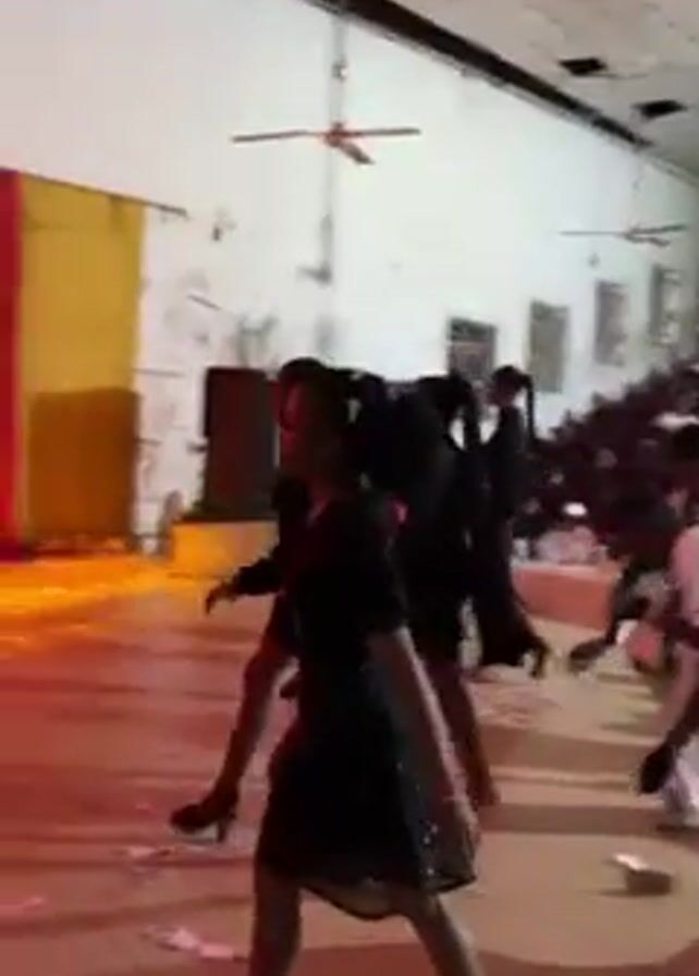 stage in a large room with a crowded audience. On stage, several women in black dresses are walking and dancing as confetti lies scattered on the floor. There are colored spotlights on the stage and the ceiling is high with exposed beams and several ceiling fans. The camera pans to the audience which is seated in rows of maroon chairs. Some of the audience members are talking, while others are looking at their phones. Some tables are set up with bouquets of red roses and white tablecloths. A man with a camera is filming from the side.
