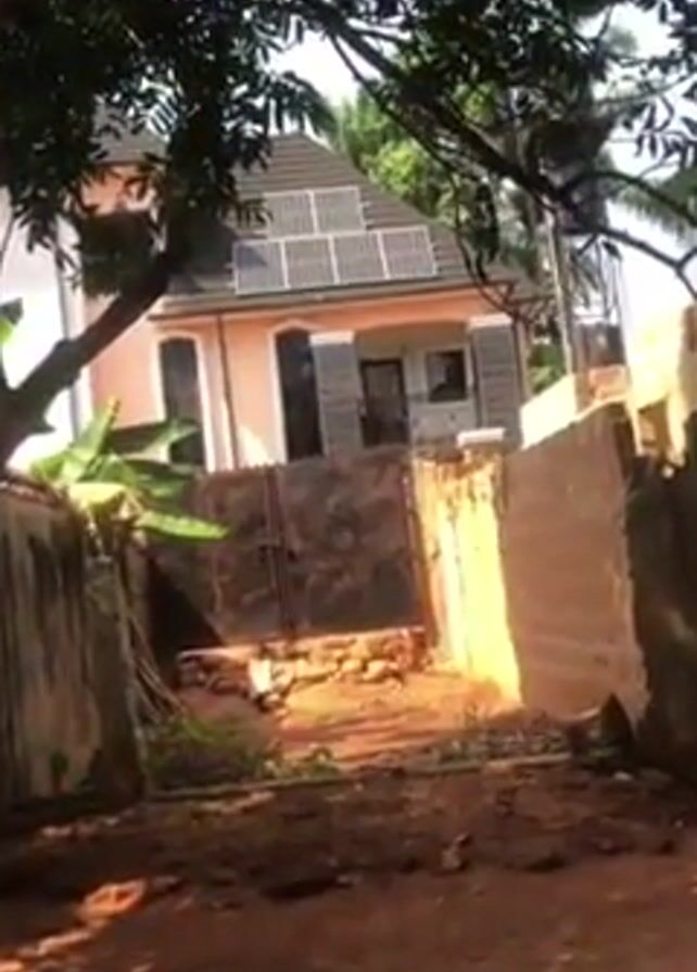 house with solar panels on the roof. The house is painted a light pink color with dark gray brick accents on the porch. A black metal gate stands in front of the house, and a partially constructed brick wall is on the right side of the frame. The camera zooms in on the house and then pans slightly to the right. An electrical sound is heard. The video is shot from a lower angle, partially obstructed by tree branches and foliage in the foreground, giving the impression that it was filmed from across a yard or open space.