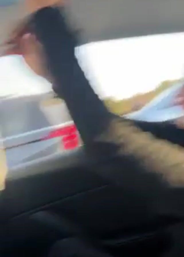 interior of a car, apparently a Tesla based on the steering wheel logo and center screen, driving on a highway. The car has a glass roof showing the clear sky outside. The first shot shows a woman in the passenger seat with sunglasses and black clothes, posing for a video. The next shot shows the driver, a man wearing a baseball cap and a light-colored shirt, with a woman's arm holding a phone showing the woman from the first shot. There are cars in the other lanes of the highway. The music in the video appears to be upbeat Latin pop.