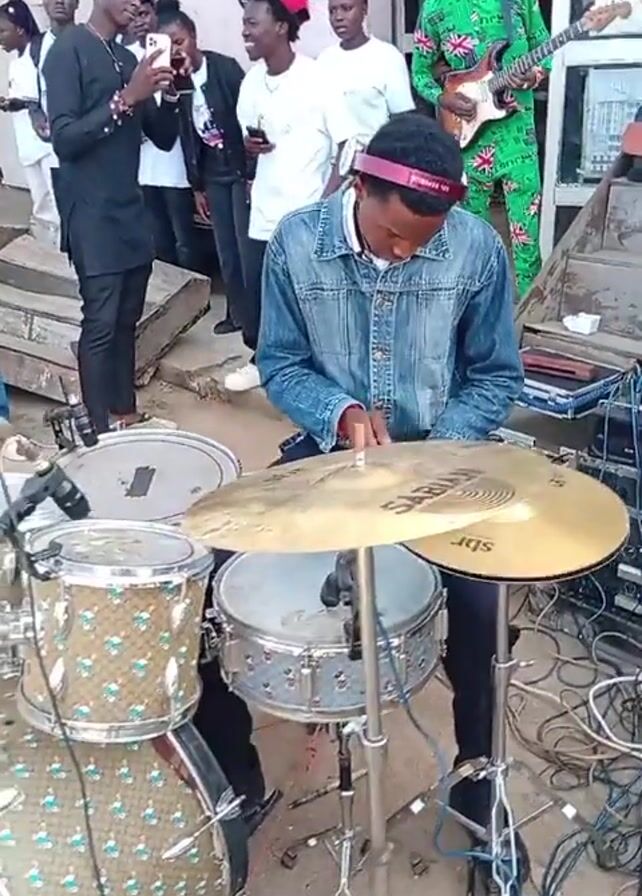 drummer playing a drum set in an outdoor setting, with a small crowd of people gathered around