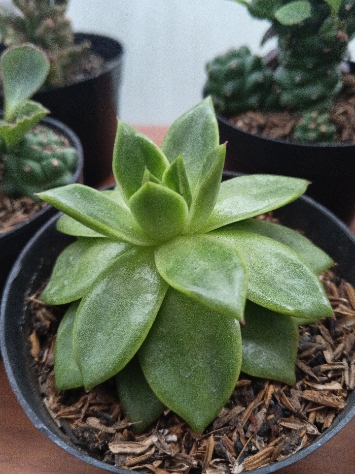 A close-up captures a vibrant green succulent arranged in a symmetrical rosette pattern inside a black plastic pot. The pot's contents consist of brown, mulch-like material. The succulent's leaves are thick and pointed, densely layered around a central point. In the blurred background, additional potted plants, including cacti, rest on what appears to be a wooden surface. The overall image has a natural light and a shallow depth of field, emphasizing the main succulent.