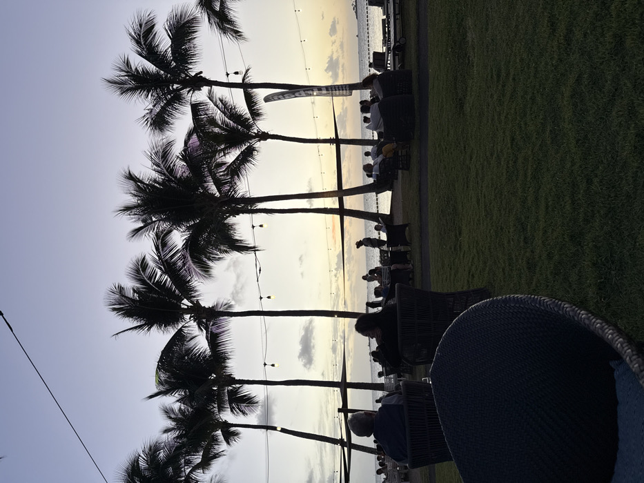This image captures an outdoor evening scene at sunset in Noumea, France. The perspective is from a low vantage point, with the dark, woven back and right armrest of a chair, partially revealing a light blue striped cushion, prominent in the lower-left foreground. A manicured green lawn occupies the midground, extending to a body of water in the background. Multiple groups of people, approximately 20 to 30 individuals, are visible seated at dark, woven chairs and tables arranged on the grass. In the immediate midground, two individuals are prominent: one with their back to the camera, wearing a dark top, and another to their right with long dark hair, facing towards the right. These individuals, and others further back, appear engaged in social interaction or leisure. A series of tall palm trees, silhouetted against the sky, lines the midground. String lights with illuminated bulbs are strung between these trees, providing ambient light. A white vertical banner or flag is partially visible on the far right, positioned near a palm tree. Beyond the lawn, a calm body of water, likely a bay or ocean, extends to the horizon. A white floating barrier or rope is visible along the water's edge. Faint outlines of distant landmasses or vessels are discernible on the horizon. The sky transitions from a pale purplish-blue overhead to a soft orange and yellow glow at the horizon, characteristic of sunset or dusk, with scattered, light clouds present near the horizon.